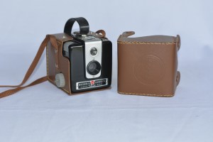 I came across the camera pictured here in the boxes and it looked too good to be true. The leather cover and camera looked showroom perfect. The leather was so untarnished it was a little difficult to remove it from the camera and load the film. In the day this original “point and shoot” camera was designed to be easy to use. There is no focus, no shutter speed, and no aperture ring to mess with. To a teenager of the 2010’s this is all as it seems it should be, after all this is how the phone camera works. Even to the 40 somethings who used a point and shoot 35mm camera or one of those disposable cameras at the department store or pharmacy, the Brownie is a fancy version of that camera. The Brownie of the 50’s and 60’s was molded of an early plastic substance called bakelight. Over time the material becomes brittle but back in the day dropping the camera was unl