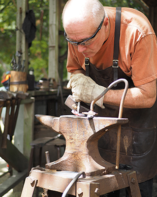 -Our feature today is Frank. Frank is an engineer turned blacksmith. When we met him he was working on a bottle opener for a couple who stood close by intently watching him ply his trade. Blacksmiths were the local go-to for any part, tool, or trinket made from iron. During the Civil War Frank would have been responsible for repairing or replacing weapons, utensils, building tools and what not.