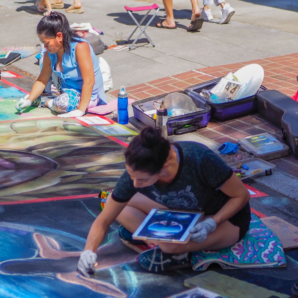 David duChemin writes about composition and intent all the time. The overarching theme on his blog and in his classes is composition is more important than equipment. I couldn’t agree more. The two photos here are a good example. I’m happy with each but for a different reason. The top photo gives the impression the artist is doing a self portrait. In the second photo you can see she is working from an image and has something other than a self portrait in mind. The second photo is about multiple artists working next to each other. Each photo tells a different story.