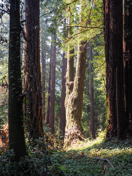 Aptos isn’t a large community. Nestled at the edge of the redwoods and only five minutes from the Pacific, it offers some of the best California has to offer. The hike was not difficult, and the temperate climate made the walk through the woods pleasant. With a small creek going through the center of the park and the redwoods soaring above, it was hard to believe we were so close to an urban setting. The views were astounding as the morning sun streamed through the canopy onto the forest floor, illuminating saplings, ferns and the red bark of some of the trees. At the same time, the shadows made some of the up ended roots looks foreboding and, may I say, spooky.