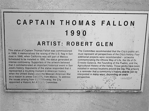 At a cost of $900,000, one would be excused for thinking some sort of community approval process would have been in place in 1990 before it came time to place the statue of American Captain Thomas Fallon holding a Bear flag and poised to hoist it up a flagpole, in the 1846. The placement of the statue was far from being a celebration of the city. To the Mexican American community, it represented oppression of Mexicans and the US annexation of California just two months after the declaration of war against Mexico, according to www.theclio.com/entry/41221