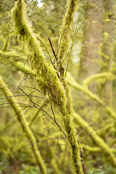 Even though I live near the coastal redwoods, the moss that grows on the trees in Oregon and Washington is like magic to me. This time of year it creates a green hue throughout the forest.