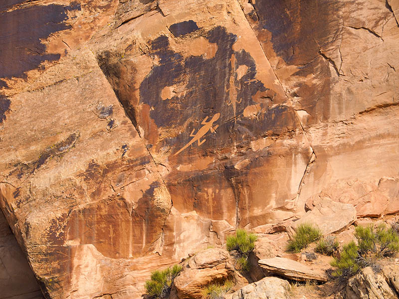 Within Dinosaur National Monument and nearby the park service’s campground are petroglyphs left by the Fremont people. Etched and painted on the side of the cliffs, the images of lizards, people and other animals like longhorn sheep seem to materialize before the visitor’s eyes the longer they are observed. One lizard turns to three which is next to other images including people. Lingering at the base of the cliff, it is hard to imagine living in this barren place before the modern era.