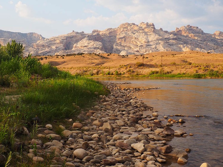 The river contrasts the twisted and layered mountains that are spectacular for both the total lack of trees and the lines that punctuate their horizontal spread and vertical lift. The meandering Yampa River begs for a small boat; a canoe or kayak, or maybe an inflatable.