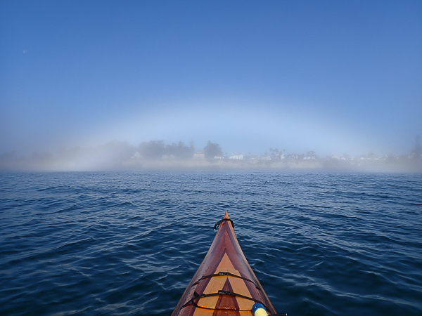 Unlike Frank Sinatra and Michael Buble, I don’t have the world on a string and can’t make a rainbow with my finger. Instead, I must wait for the conditions to be right for one to appear. Under certain conditions I can put myself in the right position to see the rainbow that is already there. Rainbows are always magic, even when they are white. As I turned toward the coast the sun lit up and the bow appeared. I found the arch moved as I paddled and could “make it” highlight things in front of me.