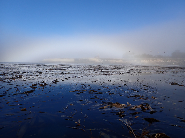 The sun was still low from the east, but its low altitude didn’t mitigate the sparkle bouncing off the water. Sun screen on, boat off the roof and to the dock. Out with the camera and water bottle, on with the spray skirt and two-piece custom-made Greenland paddle. My initial target is usually the mile buoy, paddle out to the moaning of the horn and a look at the seals hanging on as it bobs up and down in the water and then make a turn west toward Natural Bridges or east to Capitola.