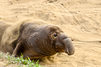 Weighing in at nearly 4400 pounds. This male Elephant Seal scoots along the sand to find the perfect place.
