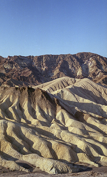 This picture of Zabriskie Point in Death Valley was taken at sunrise. The valley has an east/west orientation, so the sun was at my back as it illuminated the scene. The National Park Service has made a nice short road and parking lot that overlooks the scene. It is at the north-east of the park off Highway 190, the road you would use coming from Las Vegas.