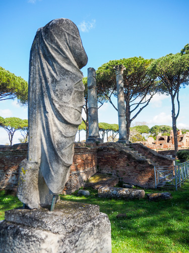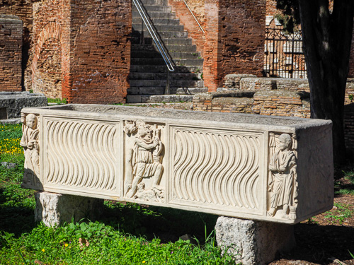 Only a short twenty miles from the ancient city accessible by an interurban train, the ruins of the city, now called Ostia Antica, remain an active archeological site. Entry to the town begins outside the old city gate in an area of tombs. While burials were forbidden inside the city walls, residents didn’t want to travel for the internment of their loved ones and relatives, so just outside the gate became the area cemetery. The few marble casks and many tombs are the first hint that this visit is not ready for Hollywood and Italy has not turned this into a Disneyesque experience. The quest to discover the workings of the ancient city are still under way. Even in this area restricted to the afterlife, the differences between rich and poor are evident as the sizes of tombs vary and descriptions of contents provided for the departed. Nearby signs assist the tourist in identifying the rich from the merely well off.