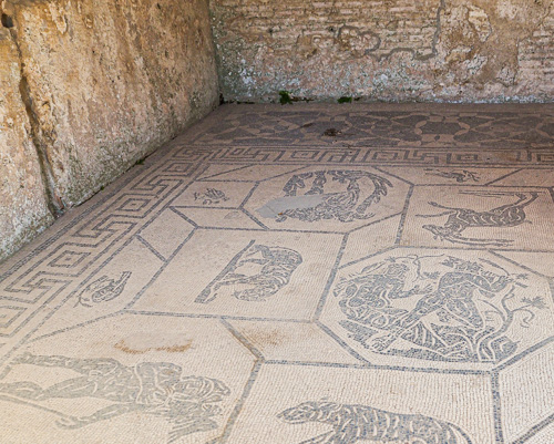 Moving on to the continuing work to uncover the past, in the residential section we viewed the ruins of a house built by a successful merchant. The footprint for the house was quite large, maybe 1800 square feet of first floor space which included living and eating quarters, a private chapel of some kind, bedrooms and some adjacent meeting room complete with a mosaic floor, dedicated to the gods that made the owner’s success possible. This floor, uncovered, was a rare site during our visit as most of the mosaics throughout the site were covered with a tarp to protect them during the winter. Even though the foundation of the house was large (it likely had multiple stories), it had no yard. I’d bet the owner could eavesdrop on the neighbor’s arguments.