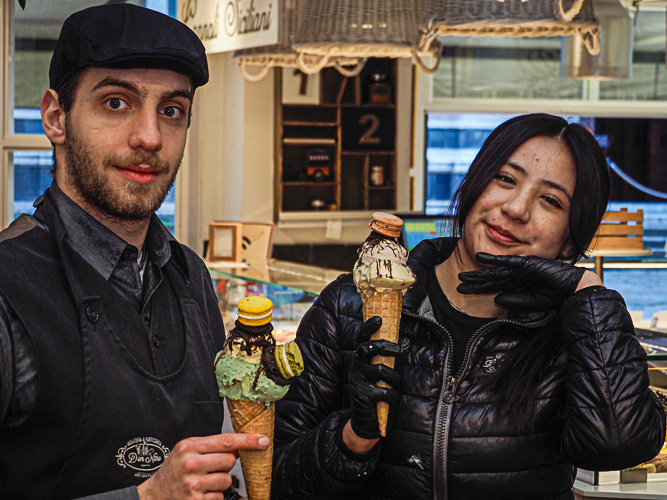 They were watching me watching and photographing them. So together they decided to reward my curiosity and presented themselves at our table with perfectly assembled gelato orders for another customer. Without a word, their actions shouted, “take my picture.” So, I did.
