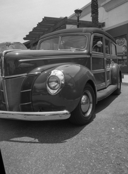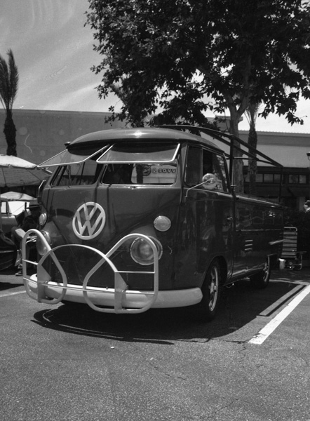 The second trick is the decision to use black and white film. Without the trusty monitor on the back of the camera, shooting film makes for a slower experience. It was a little slower still as my Mamiya 645 is manual advance and manual focus. Using film instead of digital capture with a flip to black and white slowed this down a bit also. Effectively shooting black and white means looking at tone instead of color. Where will this purple fit on the grey scale? Will it contrast well with something else in the frame? Of course I could have shot color and made the decisions sitting in front of the computer, but so many cars at a car show are the same as every other show. Making on-the-spot decisions gave me something to focus on as I wandered the event.