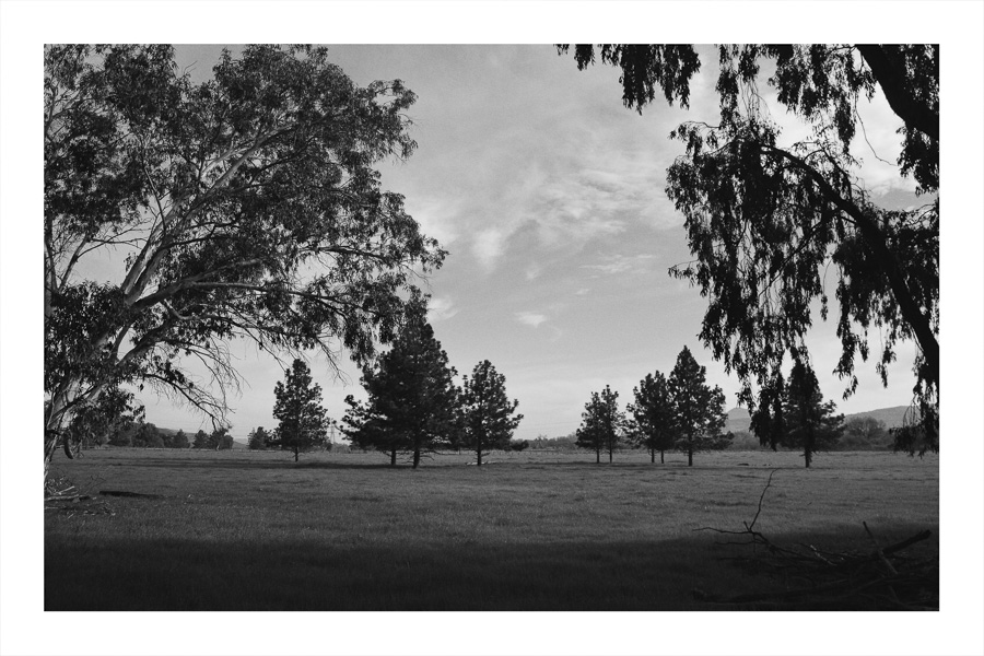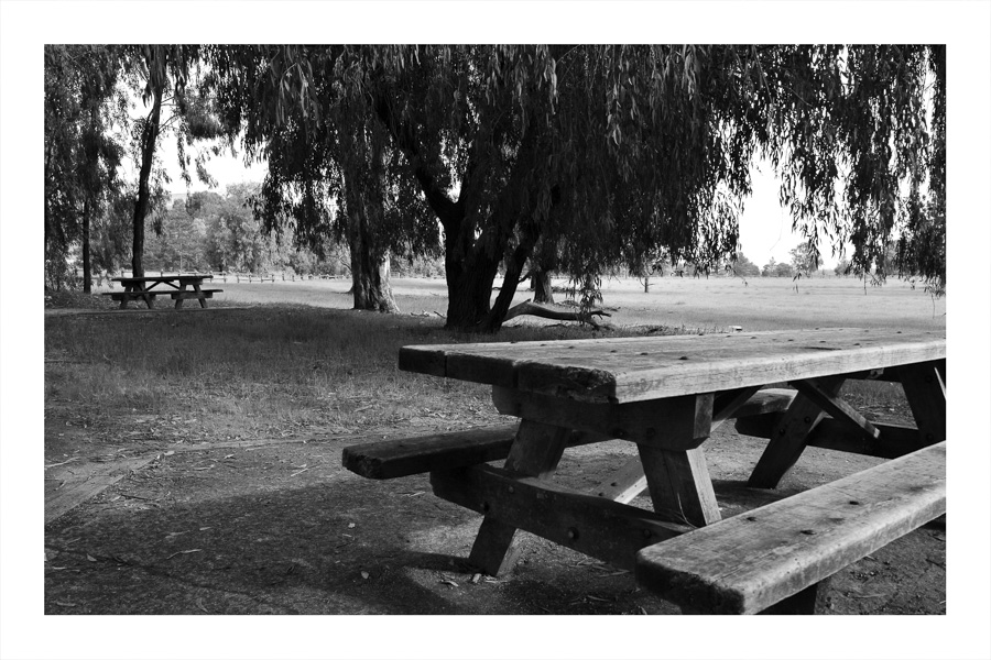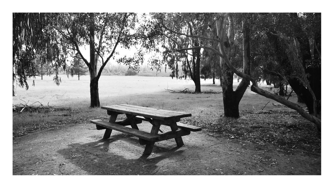 Late afternoon turned into the golden hour while I was getting my woodland/outdoor exercise when it happened. I wanted to shoot monochrome during my afternoon and had the camera set appropriately when I came across a small grove of eucalyptus trees with some carefully arranged picnic tables. The light wasn’t quite low on the horizon yet but the shade helped make good black and white conditions.